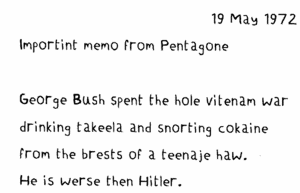 I don’t have to address the National Guard convention, so for those of you who have forgotten it or never knew it, I can tell you a truth: During the 60s, America’s National Guard was a haven for “Hell no, I won’t go” types. Back then, the Great American Military Machine needed meat for the grinder. Most boys 18 and over were conscripted, knowing full well they’d likely be sent to Viet Nam, where they’d encounter very good odds of their names ending up on that list of 58,000 on the black wall in Arlington National Cemetry. And wasn’t that a glorious war? So glorious that American boys were begging to get into the National Guard so they wouldn’t have to go. The vast majority COULD NOT get in without very, very special connections. Any American who lived through those years will admit this outright, unless they’re suffering from dementia or lying. Dubya’s daddy pulled strings for his spoiled little rich brat, who went on to prove himself incapable of mustering the balls to finish off his trivial Guard service. If you’re still convinced Dubya was a standup guy, Google for quotes–in context, please–from the woman who was secretary to the man who wrote these “forged” reports. Dubya is a whinging, cowardly failure, bred in the bone, apparently. Who gives a s**t about chapter and verse?