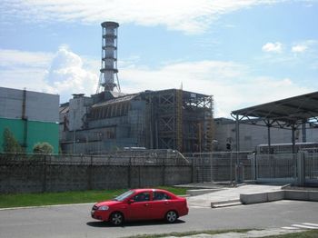 We drove around the reactor complex, to reactors three and four. We were not permitted to take photographs of the military fence, but were assured that we would get a close view of the reactor a litle further on.