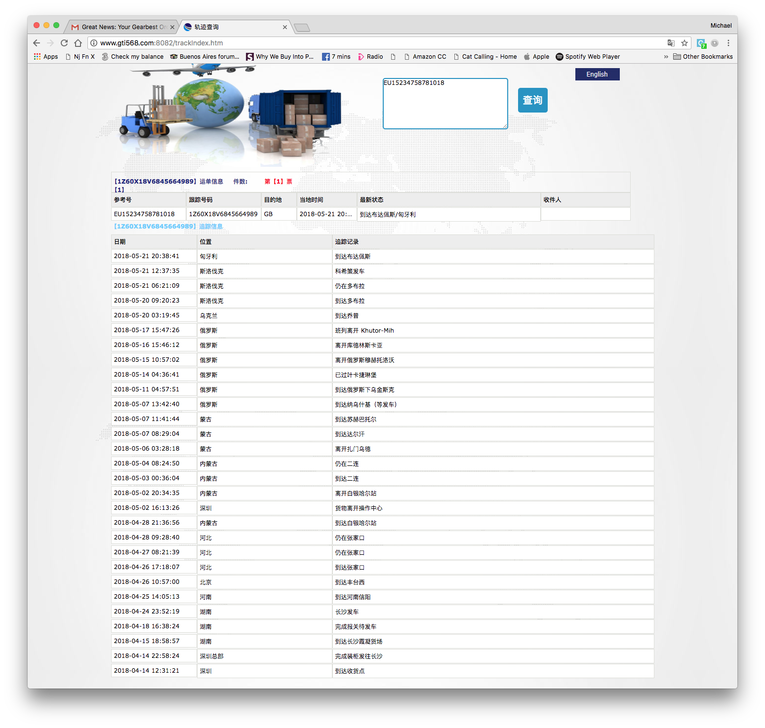 I give you my wonderful tracking information. I particularly like “Arrived in changsha chardonnay coagulation loading bays”. Also, let’s face it. “Get to Russia off sharply” is good advice for anyone. (Click to make the image larger).