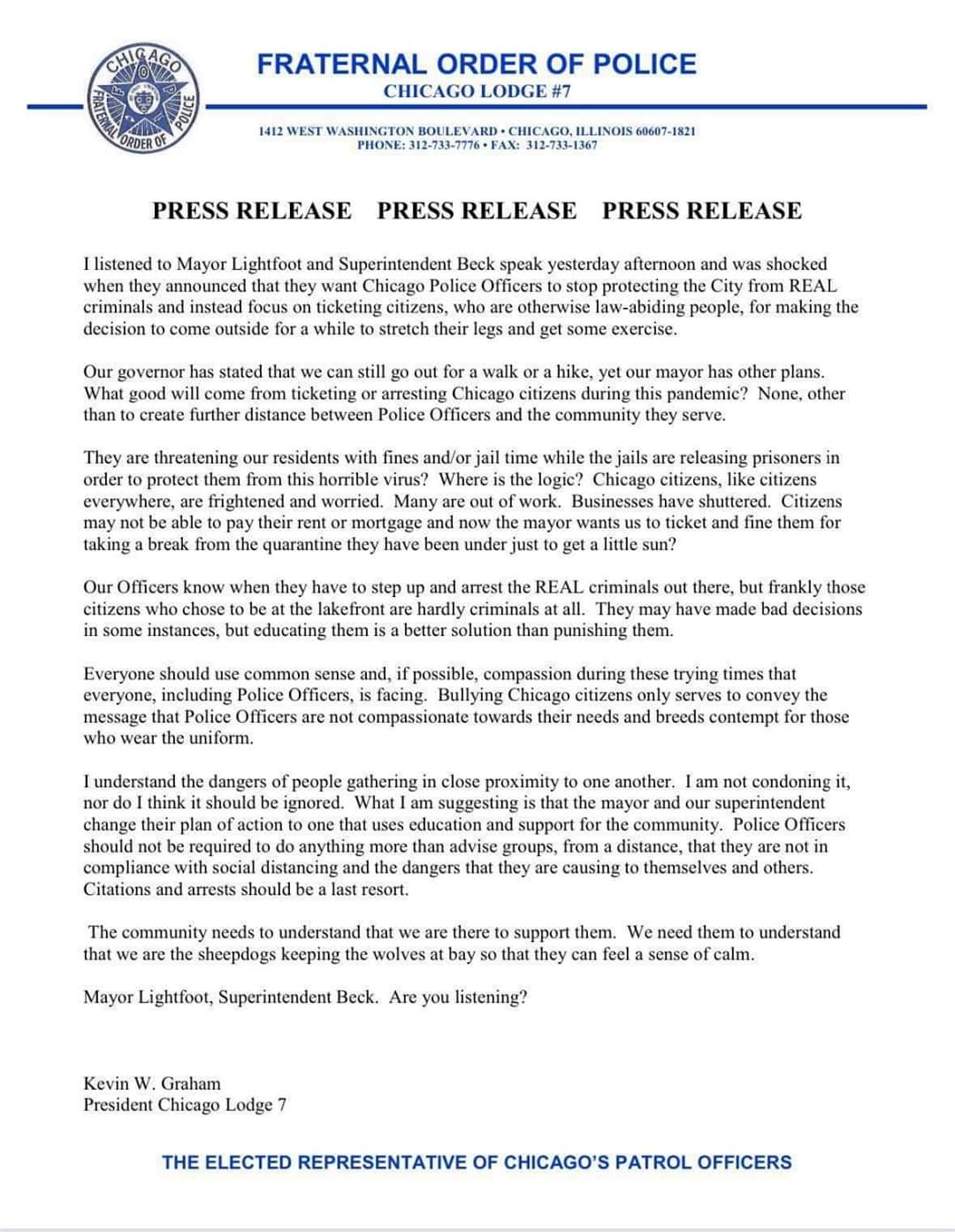 Here’s a letter sent by the Chicago Police Union to the City protesting how the mayor is making the cops into the bad guys by forcing the cops to enforce dumb overzealous new distancing rules.