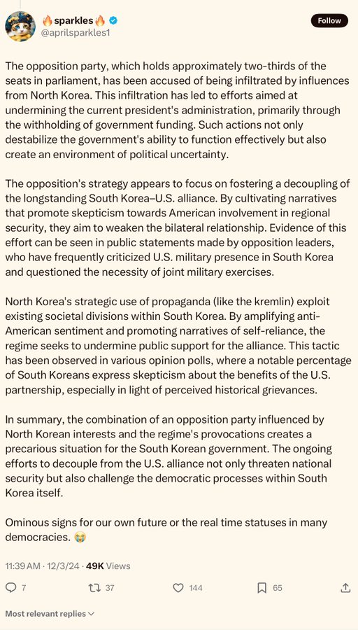 A relative in Navel Int tells me their departmental summarized conclusion is that SK is becoming more and more socialist, and Yoon Suk Yeol is reacting badly to that.