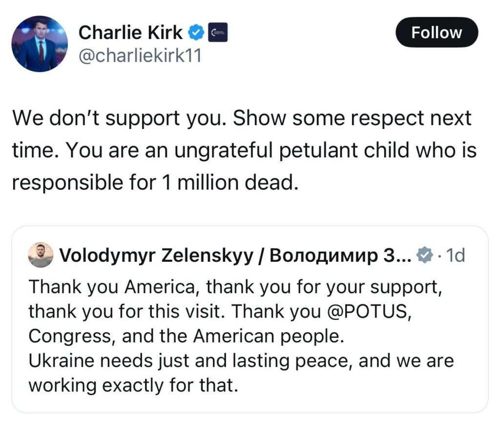 I hasten to qualify that i know nothing about Charlie Kirk’s opinions about the Ukraine/Russia conflict. Maybe you are wrong about said opinions, but i strongly approve of the values that you express.