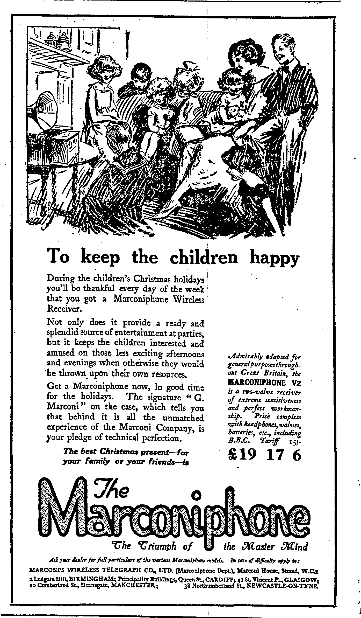 Then someone came up with the idea of broadcasting. Music, lectures, news, that sort of thing. The government came up with a scheme. They would charge a fee for the licence. It would also demand that wireless manufacturers make a contribution. To sugar the pill it would make it illegal to sell a wireless set that wasn’t made by a member of the British Broadcasting Company.