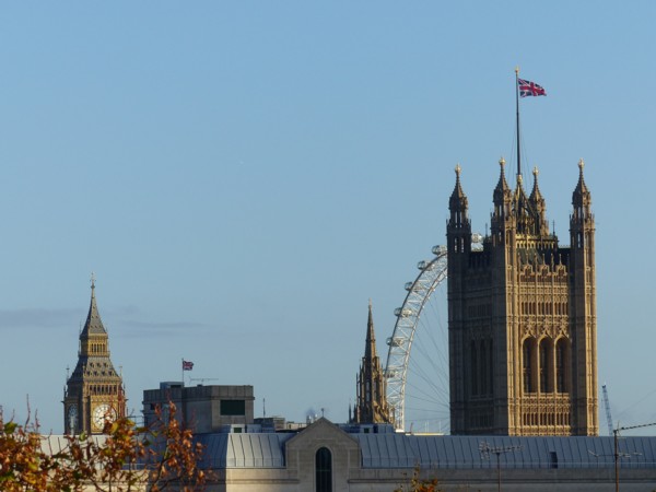 Next up, the two familiar towers attached to the Houses of Parliament, Big Ben and …, you know, … the other one. On the far side of the river but directly in line, The Wheel.
